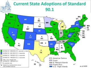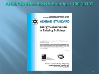 The document discusses ASHRAE's initiatives and goals around sustainability and energy efficiency in buildings. It outlines ASHRAE's programs to promote energy efficiency standards, guidelines, and education for both new and existing buildings. The goals include completing design guides for efficiency levels of 30%, 50%, and net zero energy buildings by certain target years. It also discusses the development of commissioning guidelines and certification programs to support sustainability efforts.