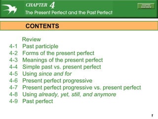 The document provides information about verb tenses and forms, including the present perfect, present perfect progressive, and simple past. It discusses the past participle forms of regular and irregular verbs. It explains the meanings and uses of the present perfect, present perfect progressive, and how to use time expressions like "since" and "for" with these tenses. Examples are provided to illustrate the different verb forms, meanings, and the differences between the simple past and present perfect tenses.