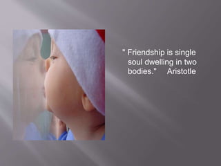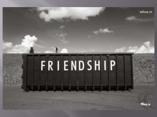 This document discusses the value and meaning of true friendship. It describes friendship as a unique bond between two souls that lasts through disagreements and arguments. Key aspects of friendship highlighted include choosing to become friends, sharing deep details with friends that are not shared even with family, and viewing a friend as a confidant and shoulder to lean on. The document stresses that friendship is a foundation necessary for life and love.
