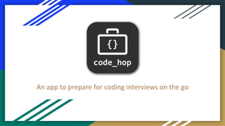 Stuart is a computer science student who has an interview with Google but does not have time in his busy schedule to properly prepare. Normally, Stuart stays up late cramming Leetcode questions and feels unprepared in his interviews. He wants to make use of his in-between time, like when waiting for class or on the bus, to look up interview questions and company information online to better prepare. The document proposes developing an app called Code Hop that would allow students like Stuart to practice coding interview questions during their spare in-between moments to help feel more prepared for technical interviews.