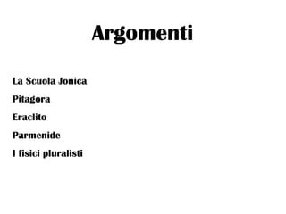 Il documento esplora le origini del pensiero filosofico presocratico, analizzando le principali scuole di pensiero come quella ionica e pitagorica, e i contributi di filosofi come Eraclito, Parmenide e Zenone. Si approfondiscono le tematiche legate all'archè, alla cosmologia, alla dualità dell'essere e del divenire, e ai paradossi del movimento. Inoltre, vengono discusse le differenze tra conoscenza sensibile e razionale e la concezione della realtà come unitaria e immutabile secondo Parmenide.