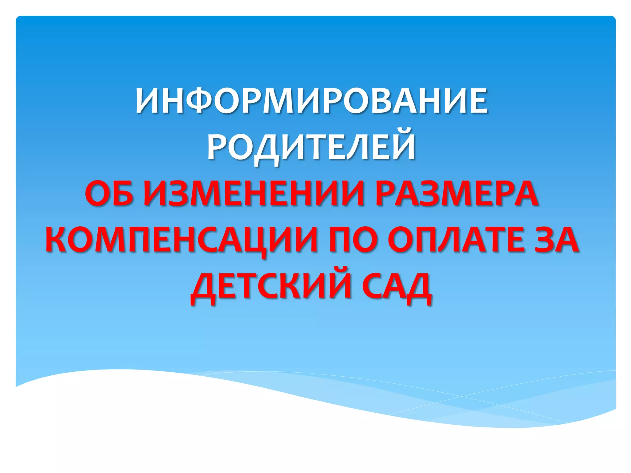 Документ информирует родителей об изменении размера компенсации за детский сад, опираясь на федеральные и региональные законы. Указаны мероприятия по освещению информации для родителей через различные каналы, включая официальные сайты и стенды в детских садах. Также подчеркнута важность ознакомления родителей с изменениями на родительских собраниях.