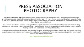 The Press Association is the national news agency for the UK and Ireland, providing multimedia content across various platforms for 145 years. It offers fast, accurate feeds of text, data, photos and video to both digital and print clients. The Press Association also provides bespoke content marketing solutions for non-media clients across major UK print, broadcast, digital media and public sectors.
