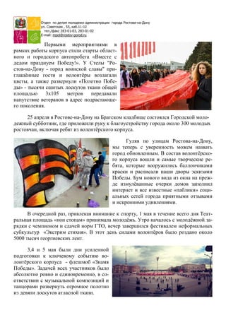 Документ описывает работу волонтерского корпуса, созданного в честь 70-летия Великой Победы в Ростове-на-Дону, подчеркивая активное участие молодежи в патриотических мероприятиях. В нем представлены инициативы волонтеров, включая флешмоб «Знамя Победы» и другие акции, направленные на сохранение памяти о ветеранах. Глава города и представители молодежного отдела подчеркивают значимость этих мероприятий как для участников, так и для ветеранов, указывая на развитие волонтерского движения в регионе.