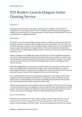 XYZ Roofers have launched a citywide gutter cleaning service in Glasgow, which will complement their existing roofing services. They are offering an introductory package that includes a gutter cleaning and roof examination for as low as £10, with a no-obligation guarantee. This service addresses potential hazards of clogged gutters, ensuring residents' peace of mind during the autumn and winter months.