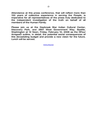 The "Four Amigos" representing the African, Asian, Latino, and Native American communities will unite for the first time since 2000 to raise their voices against the devastating impacts of President Bush's budget. The budget will gravely affect education, healthcare, and the environment through cuts to 141 domestic programs while increasing military and tax cuts for the rich. As leaders representing 80% of the world's population, the "Four Amigos" will outline the social consequences of the budget at a press conference on February 10th at the Daybreak Star Indian Cultural Center in Seattle.