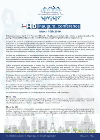 The European Institute For Innovation Thr~ugh Health Data (i~HD) will launch at its inaugural conference on March 10, 2016 in Paris. The conference will present the IMI EHR4CR platform for connecting securely to clinical data across Europe to help plan clinical trials. i~HD aims to accelerate development of innovative medicines by improving quality and sharing of health data while respecting patient privacy. Major pharmaceutical companies and patient advocacy groups are invited to learn about using the EHR4CR platform to enhance treatment options through more efficient clinical research.