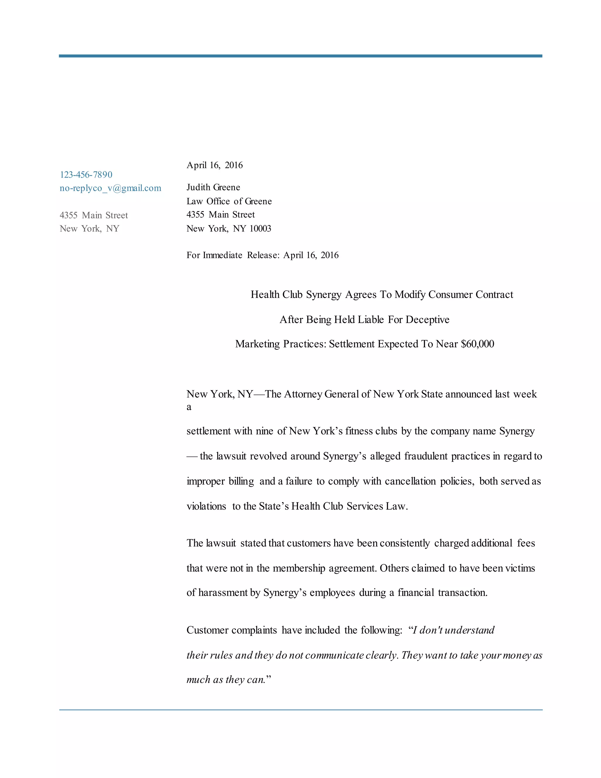 The document summarizes a settlement between the New York Attorney General and Synergy, a fitness club company, regarding deceptive business practices. The Attorney General sued Synergy for improperly billing customers and failing to comply with cancellation policies. As part of the settlement, Synergy agreed to pay $60,000 in penalties and fines and restructure its contracts to comply with state law. The Attorney General stated they will not tolerate companies using illegal practices to profit at the expense of consumers.