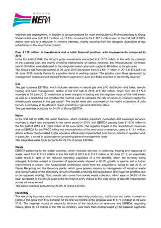 The Hera Group Board of Directors approved the consolidated results for the first half of 2016, which showed rising profits, positive cash flows, and reduced borrowing. Key highlights included a 2.4% increase in EBITDA to €470.1 million and a 12.8% rise in net profits for shareholders to €121 million, driven by growth in electricity and waste businesses as well as acquisitions and cost efficiencies. The financial position also improved, with net debt decreasing from €2,651.7 million to €2,624.4 million.