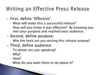 The document provides guidance on writing effective press releases, including defining the purpose and audience, proper formatting, key sections of a release, and distribution options. It emphasizes that the headline and first paragraph are most important to engage the reader. The body should use an inverted pyramid structure and include facts and quotes. Contact information and a company description are also recommended. Media alerts are described as a type of press release that functions as an invitation for media to cover an event.