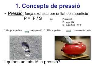 1. Concepte depressió Pressió: força exercida per unitat de superfície P = F / S on P: pressió F : força ( N ) S : superfície ( m 2 ) * Menys superfície més pressió / * Més superfície pressió més petita I quines unitats té la pressió?
