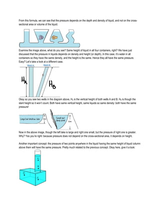 Pressure is defined as force per unit area. It depends on the force acting and the area over which that force is applied. Pressure inside liquids increases with depth due to the weight of the liquid above. Atmospheric pressure is the pressure exerted by the atmosphere and is approximately 1.013 x 105 Pa at sea level. Barometers and manometers can be used to measure pressure in terms of a liquid column height, such as mercury measured in cm. Points at the same depth in a liquid have the same pressure.