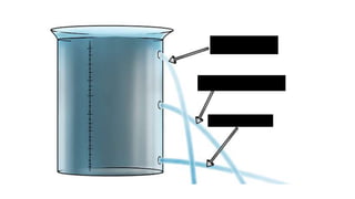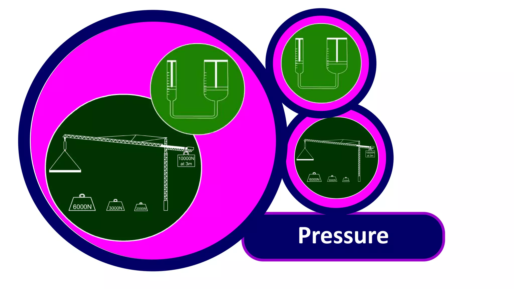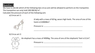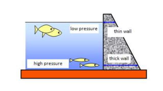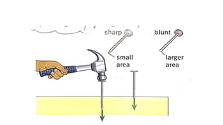 The document discusses pressure and how it relates to force and area. It provides examples of how concentrated force over a small area creates high pressure, while spreading the same force over a larger area creates lower pressure. Examples include a sharp knife concentrating force to cut versus a blunt knife, and wide desert vehicle tires or snowshoes spreading weight to avoid sinking in sand or snow. The document also covers pressure in liquids increasing with depth due to the weight of water above. Formulas show pressure equals force divided by area and examples calculate pressure using given forces and areas.