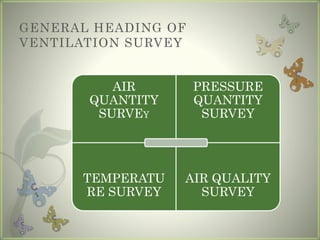 This document discusses the calculation of pressure and quantity measurement for ventilation surveys in mines. It covers determining air requirements for mine workings based on factors like diluting gases, heat, and providing breathable air for workers. Methods for calculating flow rates, pressure losses, and leakage are presented for proper ventilation system design. Key aspects addressed include determining pressure gradients, friction losses, emissions from coal faces and blasting, and total air quantity needs for the entire mine network.