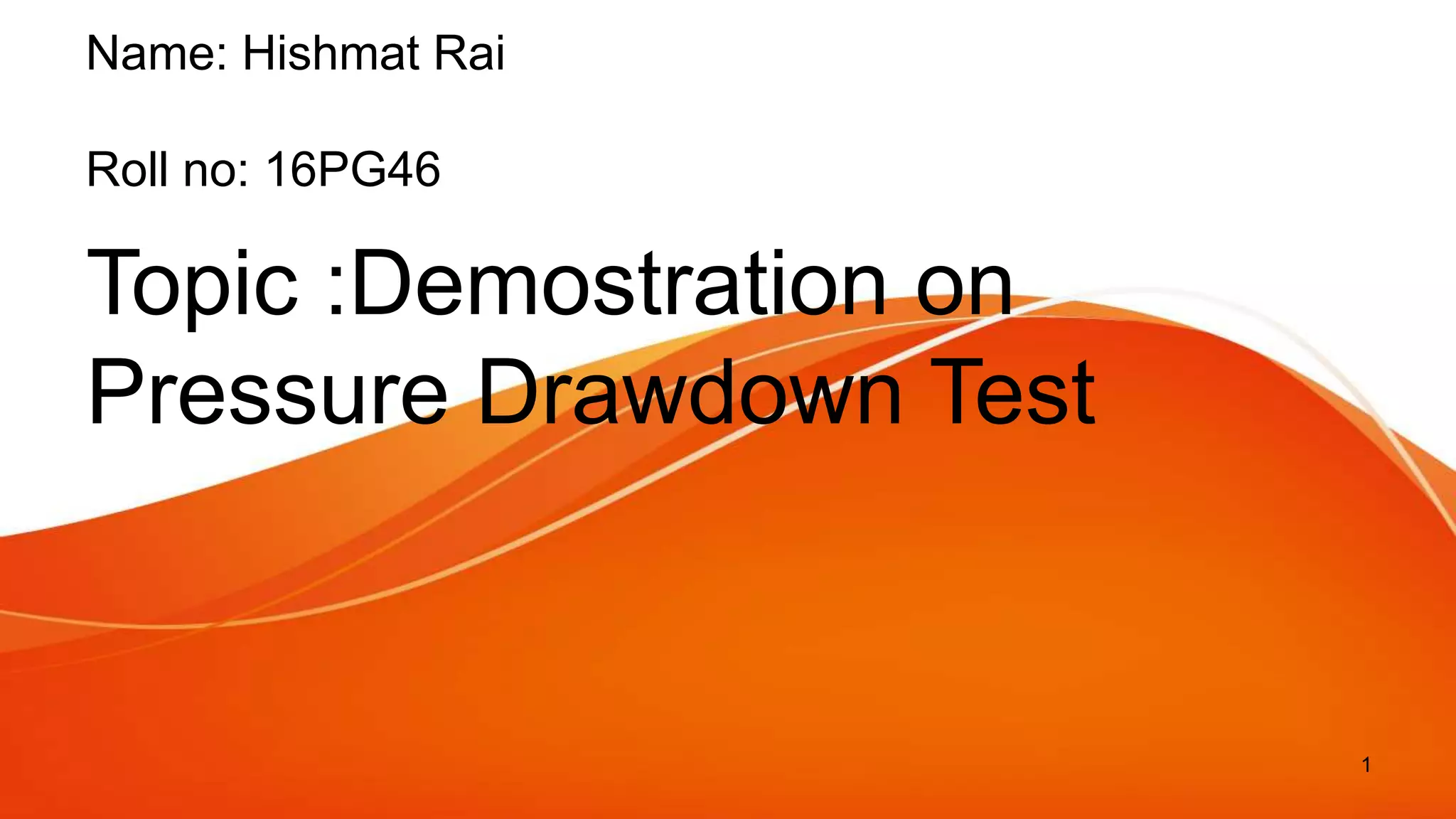The document discusses a pressure drawdown test, which involves measuring bottom hole pressure during a constant production flow after a well's shutdown. Its objectives include assessing average permeability, skin factor, and reservoir homogeneities within the drainage area. The test has advantages such as no cash flow loss during testing and applicable for new or long-closed wells, but also has disadvantages like difficulty in maintaining a constant flow rate and not determining average reservoir pressure.