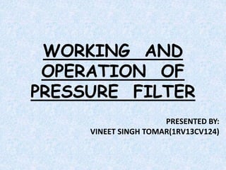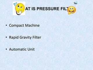 A pressure filter is a compact, automatic filtration unit that uses backwashing to clean itself. It works more rapidly than gravity filters due to applying pressure. Pressure filters have advantages like being easy to handle, flexible, and economical while providing high capacity and efficiency but can yield poorer quality effluents compared to other filter types.