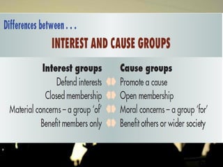 Pressure groups aim to influence government policy through lobbying and propaganda. They represent organized groups focused on a shared issue or interest. Pressure groups' power depends on factors like wealth, size, and strong leadership. They can exert influence through ministers, parliament, political parties, and by shaping public opinion. While pressure groups can promote democracy through wider participation, they also potentially threaten democracy if their influence becomes disproportionate or not transparent.