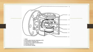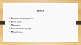 The document discusses various pressure measuring devices and their working principles. It describes McLeod gauge, Bourdon pressure gauge, piston gauge, deadweight tester, manometers, aneroid gauges, bellow pressure gauge, and spinning rotor gauge. The McLeod gauge measures very low pressures from 10-4 Torr to 10-6 Torr. The Bourdon gauge uses a coiled tube that straightens under pressure to rotate a needle. A deadweight tester precisely measures pressure by counterbalancing the fluid pressure with calibrated weights.