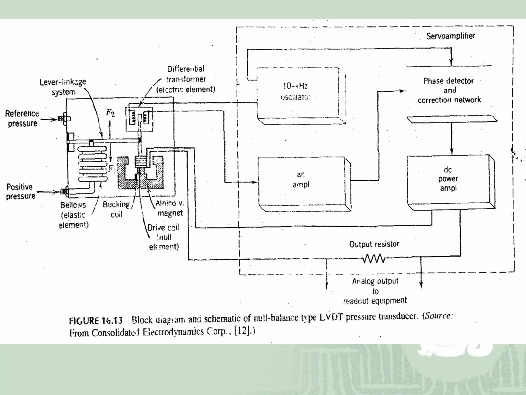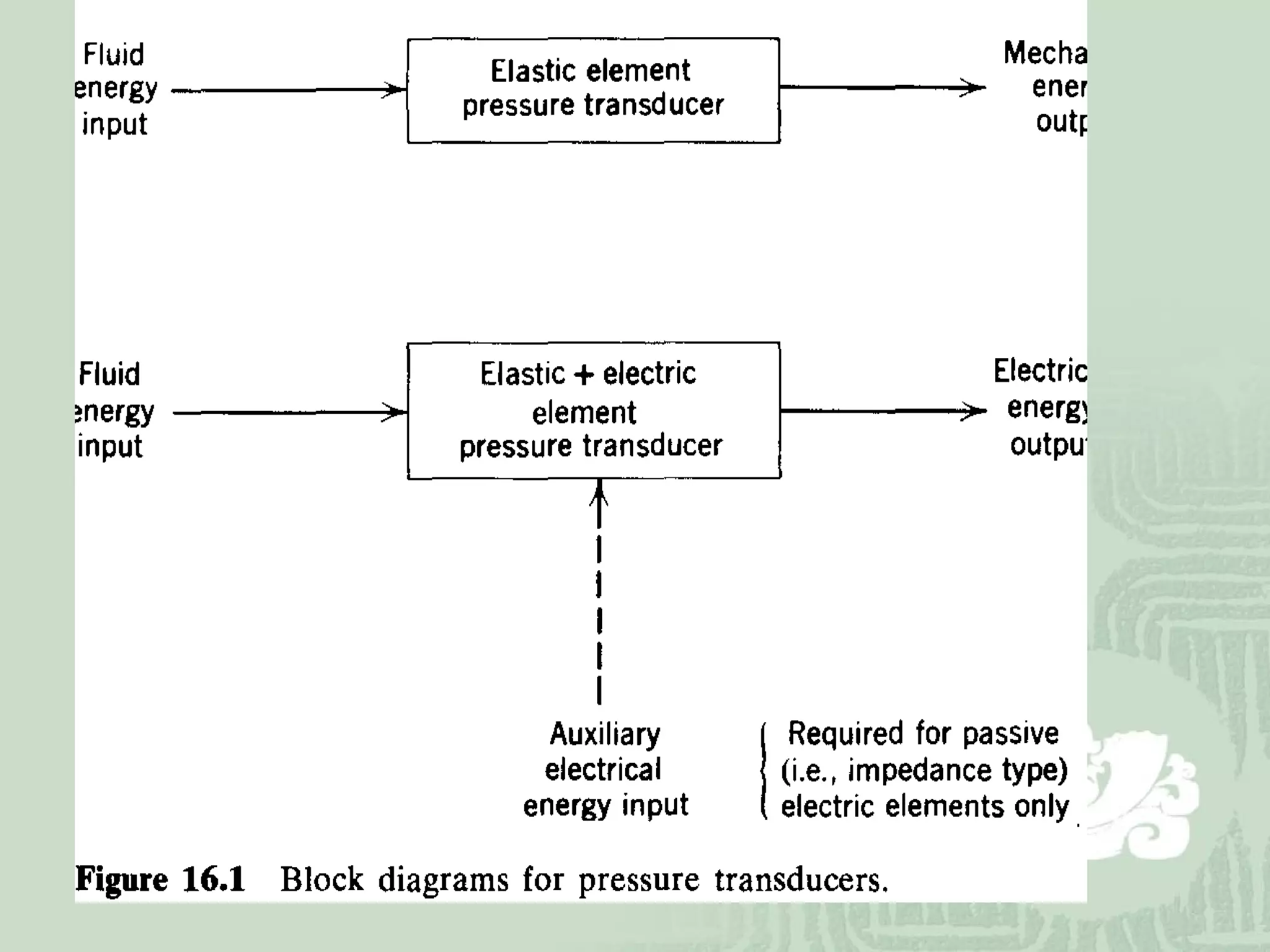 This document discusses various types of pressure transducers, including mechanical and electrical types. Mechanical transducers use an elastic element like a bourdon tube, bellows, or diaphragm to convert pressure to displacement. Electrical transducers add an electric element to convert the mechanical displacement to an electrical signal. Common electric elements are piezoelectric materials, strain gauges, capacitors, and inductive coils. Piezoelectric transducers actively generate a voltage in response to pressure, while other electrical transducers like strain gauges are passive and require an external power source to modulate their electrical properties.