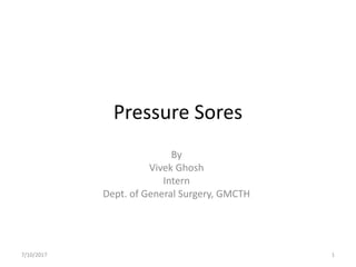 Pressure sores, also known as bedsores or decubitus ulcers, are areas of damaged skin and underlying tissue that develop when prolonged pressure is placed on certain areas of the body. They are most common on the ischium, greater trochanter, sacrum, heel, and malleolus. Risk factors include malnutrition, diabetes, peripheral vascular disease, altered mental status, and smoking. Pressure sores develop when prolonged pressure cuts off blood flow to the skin for over 30 minutes, causing tissue hypoxia and necrosis. They are staged from 1 to 4 based on severity of skin and tissue damage. Prevention through proper nutrition, skin care, pressure-relieving devices and frequent repositioning is important to