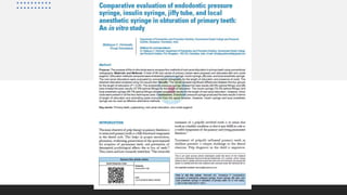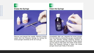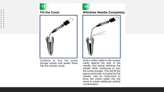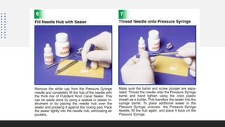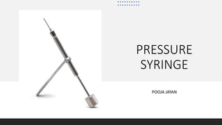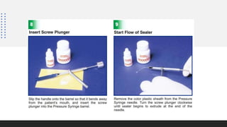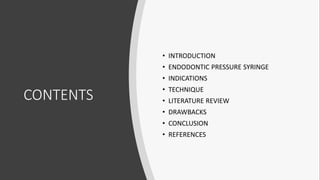 The document discusses the endodontic pressure syringe technique for root canal obturation. It describes how the pressure syringe extrudes filling material from the apex to backfill the root canal in a controlled manner. The technique is indicated for large canals, internal resorption cases, and retrograde approaches. Advantages include precision and control, but drawbacks can include overfilling and difficulty with flexible needles in curved canals. Overall, the pressure syringe and lentulospiral techniques were found to be superior depending on canal shape and anatomy.