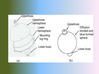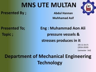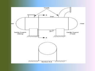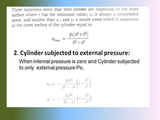 This document discusses stresses in pressure vessels. It describes how cylindrical pressure vessels experience circumferential, axial, and radial stresses. Thick cylinders have non-uniform stress distributions while thin cylinders have uniform stresses. Materials like carbon steel, stainless steel, and alloys are used in pressure vessels depending on factors like strength, corrosion resistance, cost and fabrication ease. Welded joints must meet ASME BPV Code standards. Failure analysis theories include maximum principal stress, maximum shear stress, and maximum strain energy.
