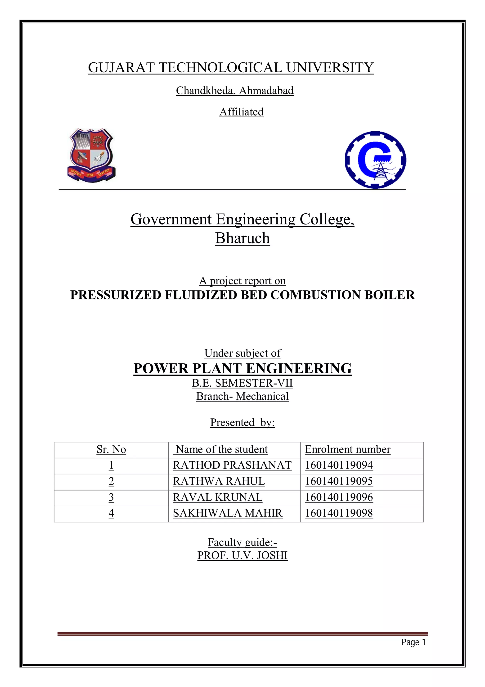 This project report discusses the pressurized fluidized bed combustion (PFBC) boiler technology, which offers a viable alternative to traditional coal firing systems by enhancing combustion efficiency and reducing harmful emissions. PFBC operates under pressure, improving energy conversion and allowing for greater flexibility in fuel types, including low-quality coals. The report highlights PFBC's advantages, disadvantages, and its status and opportunities for implementation in India, where coal remains a primary energy source.