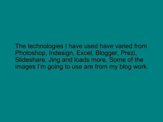 The student learned to use various technologies like Photoshop, InDesign, Excel, Blogger, Prezi, Slideshare, Jing, and QuickTime through constructing their media coursework. Blogger was used to present coursework, while the internet helped with research and blogging. Excel was used to create graphs, and a Canon DSLR took photos for a music magazine. Photoshop and InDesign were used to edit images and layout a double-page spread. A scanner captured hand-drawn plans, Prezi organized presentations, and Slideshare and Jing captured screenshots and presentations to embed in blogs.