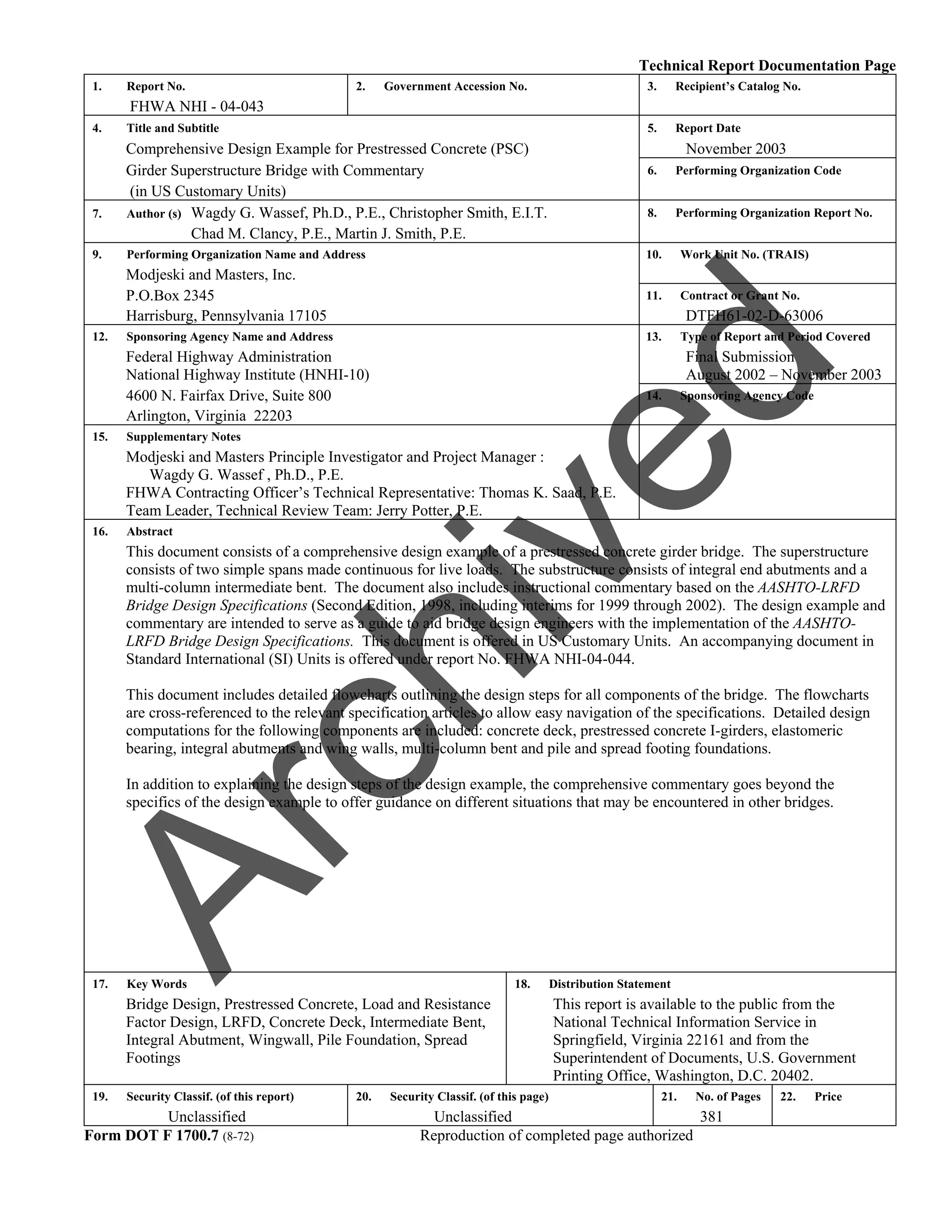 This document provides a comprehensive design example for a prestressed concrete girder bridge with two simple spans made continuous over an intermediate bent. It includes design of all bridge components according to AASHTO LRFD specifications, including: the concrete deck; prestressed concrete I-girders; elastomeric bearings; integral abutments and wingwalls; intermediate bent with multi-column pier, pile caps, and pile foundations. Accompanying design calculations and commentary are provided to aid understanding and implementation of AASHTO specifications. Flowcharts outline the design process and reference relevant specification sections.