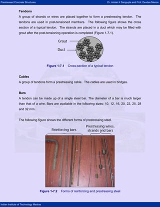 This document summarizes the forms, types, and properties of prestressing steel used in concrete structures. It discusses the following forms of prestressing steel: wires, strands, tendons, cables, and bars. The types include plain and indented wires, as well as different strand configurations. Properties covered include strength, stiffness, stress-strain behavior, relaxation over time, and codal requirements. Prestressing steel is engineered through processes like cold working and stress relieving to achieve high strength, ductility, and minimal relaxation loss over the life of the structure.