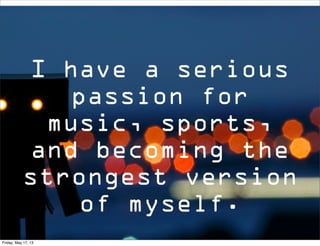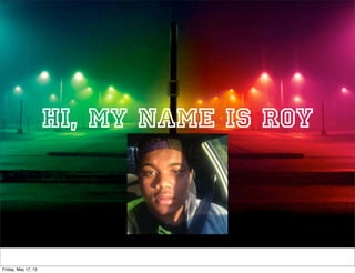 Roy introduces himself and shares his passions for music, sports, and personal development. He explains that becoming the strongest version of himself means following his dreams and becoming successful in all aspects of his life. Roy's main goals are to get his MBA and become an entrepreneur in the sports industry, and to also work as a personal trainer or start a nutrition company. He believes he has strong leadership qualities and wants to help others succeed. Roy has volunteer experience coaching kids' football camps and working with a church program. He uses bright backgrounds as a reminder to stay creative and positive about his future.