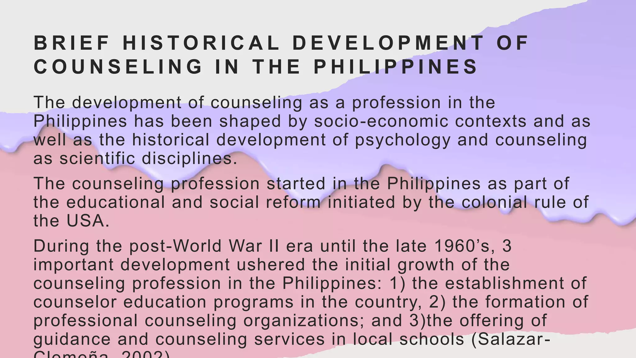 The document outlines the historical development of counseling in the Philippines, emphasizing its evolution from colonial influences and the establishment of educational and professional frameworks in the 20th century. It details key figures and legislative milestones that shaped guidance programs within the educational system, alongside the philosophies underpinning effective guidance practices. Additionally, it highlights the roles of various guidance personnel, including teachers, in facilitating student development and addressing their personal and academic needs.