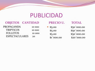 This document contains an itemized list of costs for advertising, products, services, and media for a company. It details spending of $50,000 each on propaganda like pamphlets and signs. Product costs total $3 million for items like containers, caps, and labels. Recurring service costs are outlined as $10,000 for water and $10,000 for electricity over two months. Finally, media spending is shown as $294,000 on newspapers and $500,000 on television.