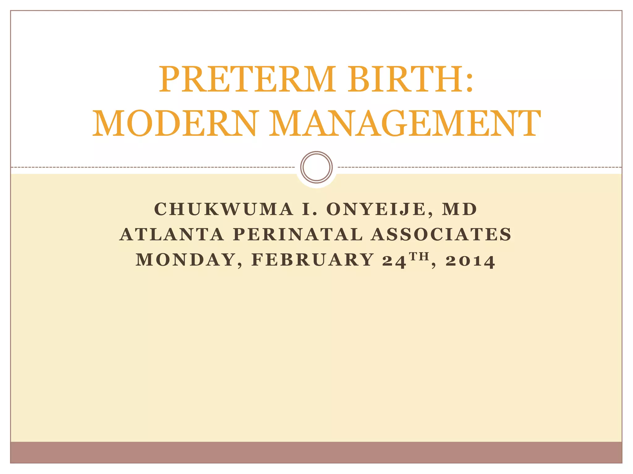 This document provides information from a lecture on preterm birth and its modern management. It begins with polling questions on topics like the percentage of preterm births in the US and trends over time. It then defines preterm birth and its subdivisions. It discusses risks of prematurity like infant death and long-term complications. It notes that since 2006, the US preterm birth rate has dropped for the sixth consecutive year. However, the US rate remains the highest among industrialized nations. The document explores factors that may be contributing to the decline in preterm births and reviews evidence on the effects of prenatal care. It also examines current understanding of the pathology underlying preterm labor and discusses progesterone and 17-alpha hydroxyprogesterone cap