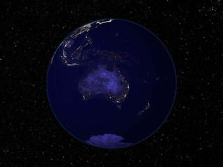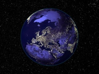 This document provides a brief tour around parts of Europe and Africa as seen from space at night, mentioning the Iberian Peninsula, North Africa, Canary Islands, Strait of Gibraltar, Europe, Northern Africa, Swiss Alps, Iceland, Black Sea, and Red Sea. It marvels at the beauty of the Earth when viewed from above, even in darkness, and encourages passing on appreciation for this "pretty blue planet".