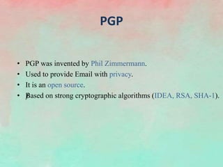 PGP (Pretty Good Privacy) is an open source encryption software that provides security mechanisms like authentication, confidentiality, compression, and email compatibility. It uses strong cryptographic algorithms like IDEA, RSA, and SHA-1. PGP protects messages by signing them with the sender's private key, encrypting them with a random symmetric key, and encrypting that key with the recipient's public key. This ensures message integrity and confidentiality. Compression is applied before encryption to save space. Radix-64 encoding allows encrypted messages to be transmitted over email. PGP's features help secure email communications and stored files from unauthorized access.