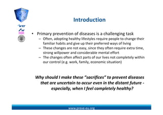 The document outlines the challenges of primary disease prevention, emphasizing the need for individuals to change their lifestyles and adopt healthy behaviors, which can be difficult due to various influences. It discusses a framework for profiling and user segmentation based on factors like health behavior, motivation, and environmental contexts, which can aid in creating effective interventions. Additionally, it explores the potential of persuasive technology in facilitating behavior change and raises questions about the complexities of targeting versus tailoring interventions for health behavior change.