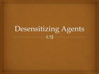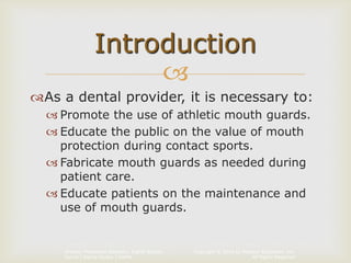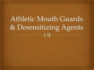 The document discusses mouth guards, including their purpose, types, and importance in preventing dental and other injuries during contact sports. It notes that mouth-formed mouth guards are most commonly used but custom-made ones provide the best protection. Dental providers should educate patients on proper use and maintenance of mouth guards. The document also discusses dental desensitizing agents that can be used in the dental office and at home.