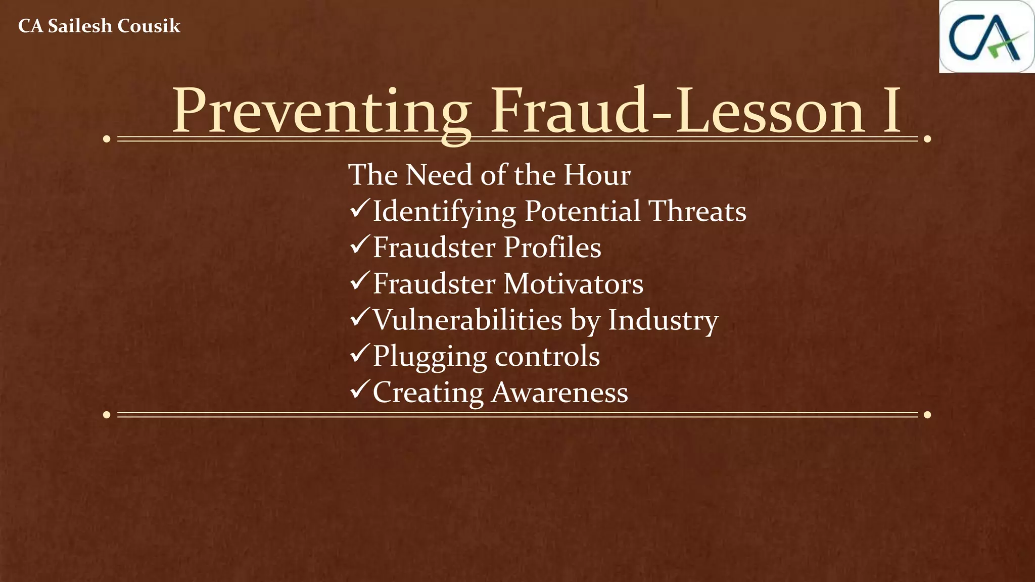 The document outlines key aspects of fraud prevention, including identifying potential threats and fraudster profiles, as well as discussing the motivators behind fraud and sector-specific vulnerabilities. It emphasizes the importance of preventive controls, continuous monitoring, and creating awareness within organizations. Additionally, it highlights analysis of fraud cases, profiles of fraudsters and victims, and the need for established processes in recruitment and vendor selection to mitigate risks.