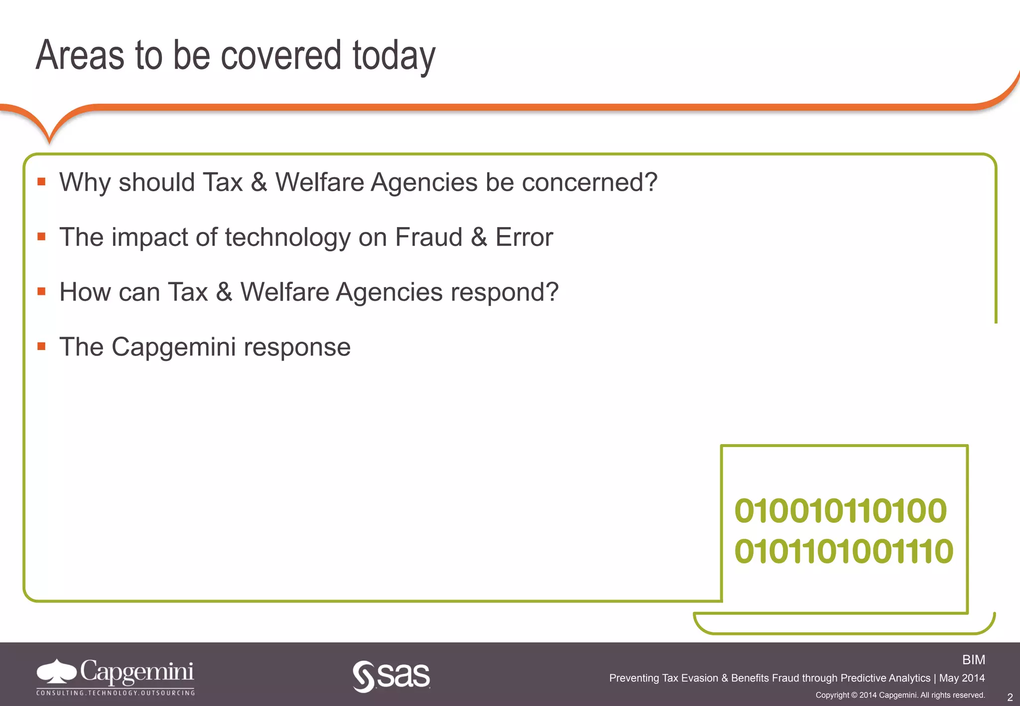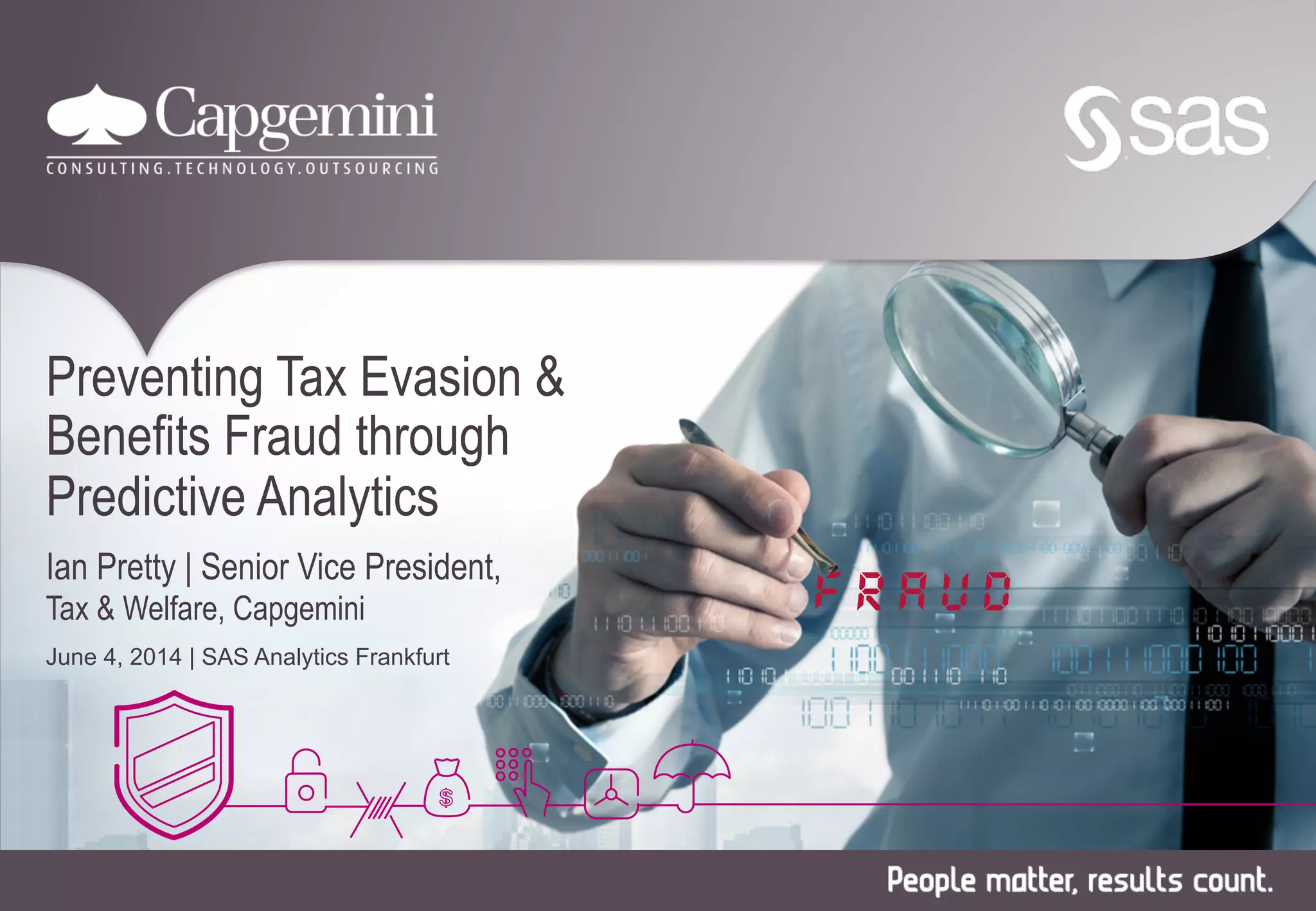 The document discusses the use of predictive analytics to prevent tax evasion and benefits fraud, highlighting the significant financial losses attributed to these issues in the EU. It emphasizes the necessity for tax and welfare agencies to adopt technology-driven approaches and advanced data analytics to improve compliance and efficiency in fraud detection. Capgemini offers a solution, showcasing their strategic risking tool for HM Revenue & Customs that has successfully recovered substantial tax yield.