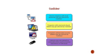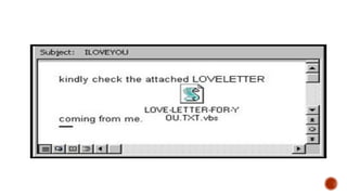 The document provides an overview of computer viruses, explaining their nature as self-replicating programs that infect host systems, causing damage and data theft. It details symptoms of infection, types of malware, notable examples of viruses, and preventive measures, emphasizing the importance of antivirus software and safe computing practices. Additionally, it outlines how to identify and respond to a computer virus attack.