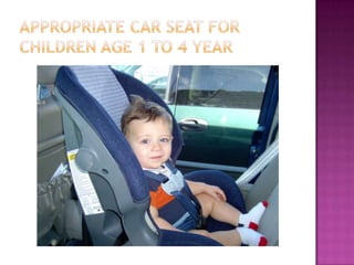 The document provides tips for preventing injuries in children ages 1 to 3 years old. It recommends keeping children rear-facing in car seats for as long as possible, baby-proofing the home by storing chemicals and medicines locked up, installing smoke alarms and creating a fire escape plan, using protective gear like helmets during activities, and teaching water safety tips to prevent drowning. It also stresses the importance of never leaving young children unattended around pools, water, or in dangerous situations.