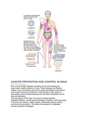 Non-communicable diseases, particularly cancer, are significant public health challenges in India, exacerbated by lifestyle factors such as tobacco use, dietary habits, and insufficient physical activity. It is estimated that around 800,000 new cancer cases arise annually, with preventive measures focusing on tobacco control and primary prevention strategies being vital for reducing incidence and mortality rates. India has initiated a national cancer control program encompassing early diagnosis, treatment, and the promotion of healthy lifestyles to combat rising cancer rates.