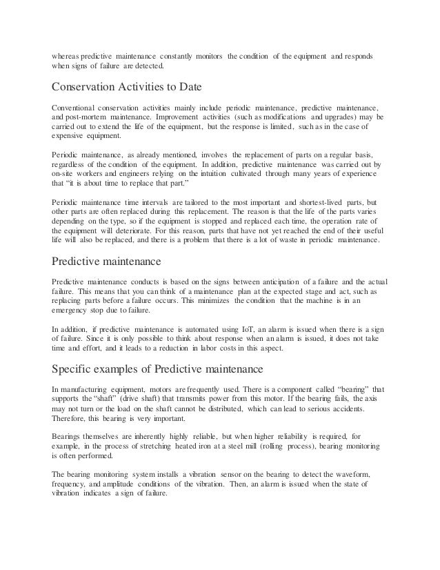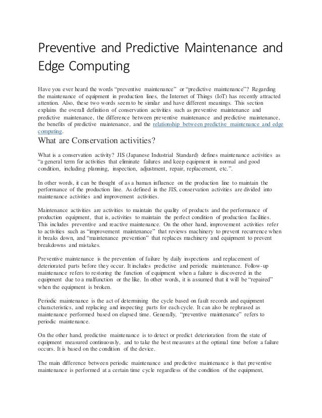 The document explains preventive and predictive maintenance in production equipment, highlighting their definitions, differences, and benefits, particularly with regard to the Internet of Things (IoT). Preventive maintenance is scheduled regardless of equipment condition, while predictive maintenance uses continuous monitoring to anticipate failures, potentially improving efficiency and reducing costs. The role of artificial intelligence and edge computing is emphasized as critical for automating predictive maintenance and addressing the decline in skilled technicians.