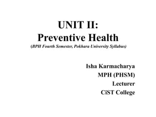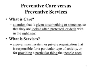 1) Preventive care focuses on evaluating individuals' current health status when symptom-free through services like screenings and immunizations to detect early health issues. Preventive services aim to fulfill population health needs through preventive measures.