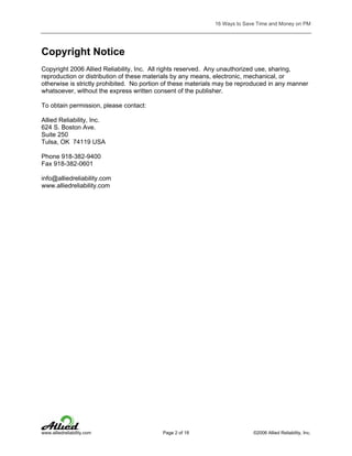 This document provides 16 ways to save time and money on preventive maintenance programs. It suggests that many PM programs are larger than needed and consume too many resources while still resulting in unexpected equipment failures. It recommends first considering predictive maintenance technologies before adding more PMs. Other tips include removing unnecessary PMs, questioning if PMs actually help productivity, getting data from PMs that can be trended over time, and ensuring PMs are completed within 10% of their scheduled due date. The goal of PM should be to detect small problems to plan repairs, not just prevent failures.
