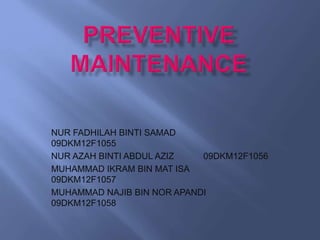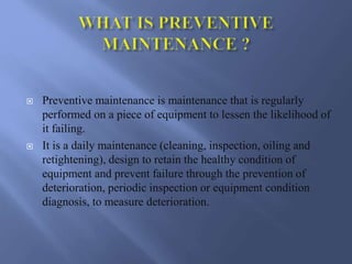 The document discusses preventive maintenance, which involves regularly maintaining equipment through activities like cleaning, inspection, and tightening to reduce the likelihood of failure. Preventive maintenance helps protect assets and prolong equipment life, improve reliability, decrease downtime and costs, and reduce injuries. It is suitable for equipment that has critical functions, failures that can be prevented through maintenance, and failure risks that increase over time. Preventive maintenance is not suitable for equipment with random failures unrelated to maintenance or non-critical functions. While it provides benefits, preventive maintenance does not eliminate catastrophic failures and includes unnecessary activities that could potentially damage components.
