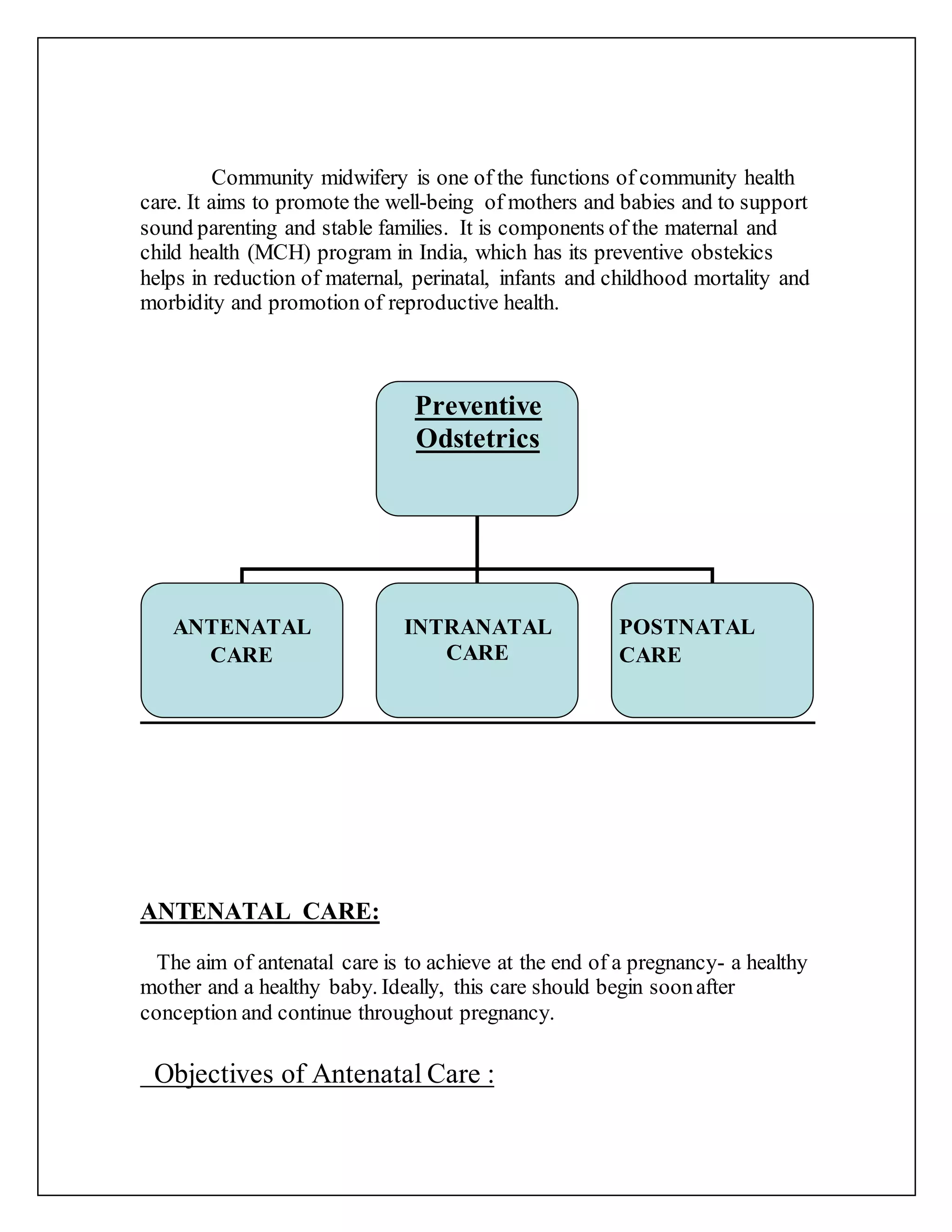 Community midwifery aims to promote maternal and child health through antenatal, intranatal, and postnatal care. Antenatal care includes regular checkups to monitor the health of the mother and baby, identify high-risk pregnancies, provide education on nutrition and hygiene, and begin postpartum family planning. Intranatal care focuses on a clean delivery to prevent infections. Postnatal care supports breastfeeding and family planning education while checking for postpartum complications over 10 days of visits. The overall goals are a healthy mother and baby as well as promoting reproductive health.