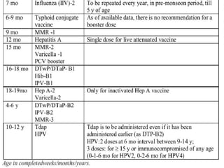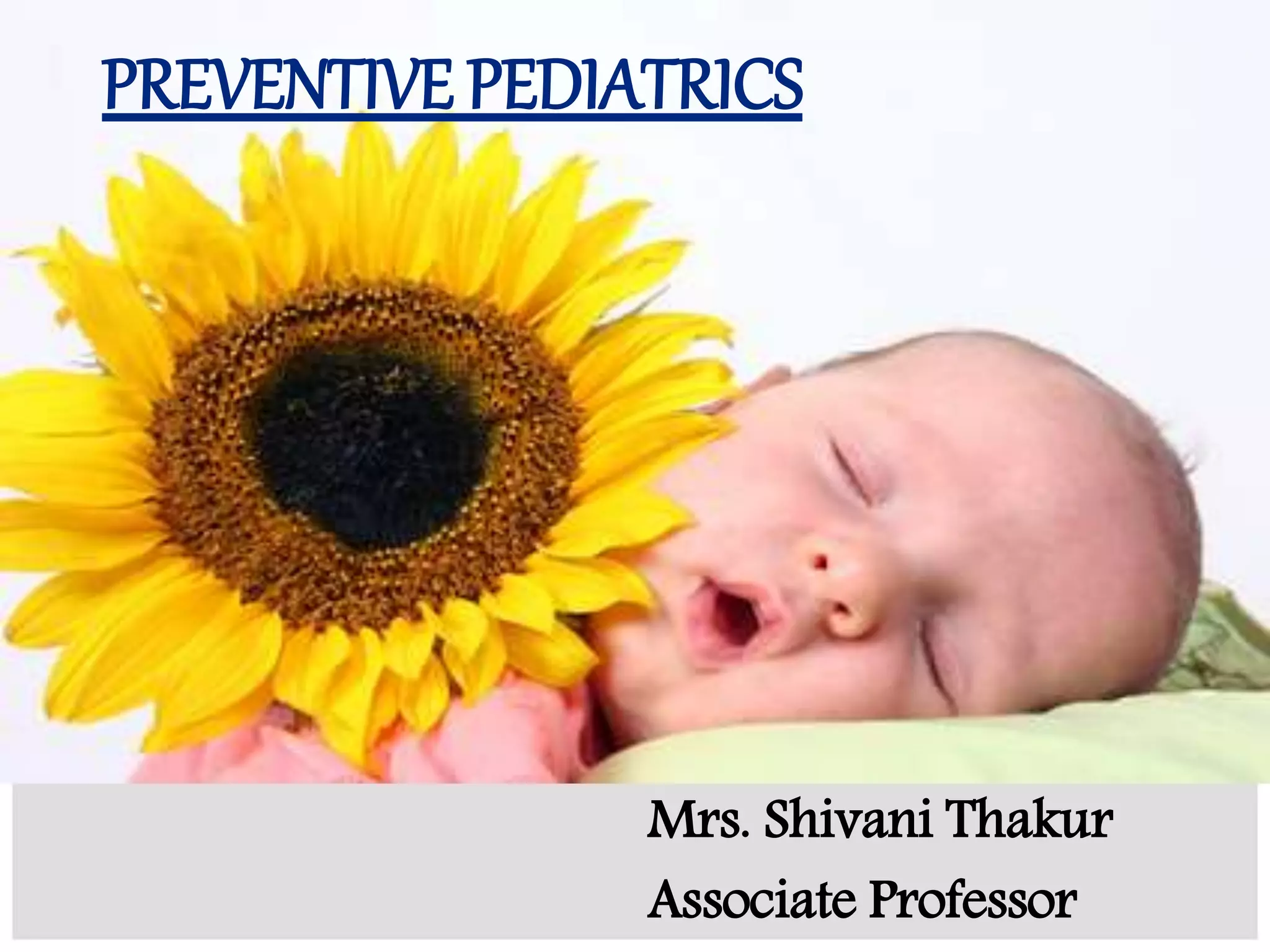 The document discusses the importance of preventive pediatrics, emphasizing that healthy children are vital to a healthy nation and advocating for integrated maternal and child health services. It outlines key components of preventive pediatrics, including nutrition, health maintenance, immunization, accident prevention, and the emotional climate at home. Additionally, it highlights the role of community and social pediatrics in addressing child health needs and the impact of maternal health on child well-being.