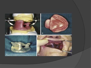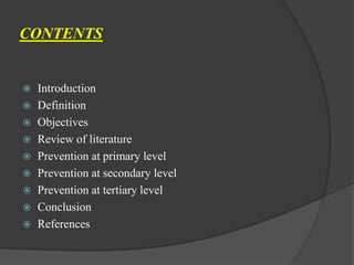 This document discusses preventive prosthodontics at the primary, secondary, and tertiary levels. At the primary level, prevention includes oral hygiene, fluoride application, diet counseling, and protective devices like mouthguards. The secondary level focuses on early detection and treatment of issues like occlusal interferences, bruxism, and sleep apnea. Tertiary prevention aims to limit disability through complex treatments, rehabilitation with prosthetics, and carefully timed extractions to prevent ridge resorption.